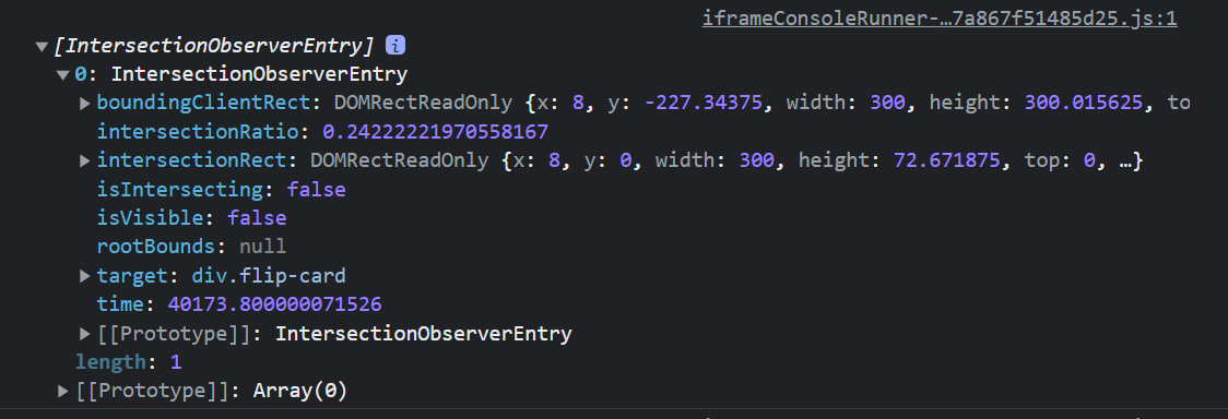 이전 글에서 마우스를 호버하면 카드가 뒤집어지는 애니메이션을 구현했는데, 추가로 구현할 부분이 생겼습니다. 바로 모바일에서는 스크롤하면 카드가 뒤집어지게 하는 것이었습니다. 이 글에서는 꼭 모바일은 아니고, 스크롤 하면 카드가 flip 애니메이션 효과를 구현해보겠습니다. IntersectionObserver라는 걸 활용해서 하는데 이것도 재미있습니다 😀 예제 코드 🌸🖥️ See the Pen Scroll card flip by Seoin (@tjdls111) on CodePen. 설명 🤗💕 Intersection Observer Api를 이용했는데, 이것은 타겟 요소와 상위 요소가 겹치는 부분을 관찰해줍니다. 그리고 페이지가 스크롤되다가, 타겟 요소가 등장하면 원하는 콜백 함수를 실행할 수 있습니다. 핵..