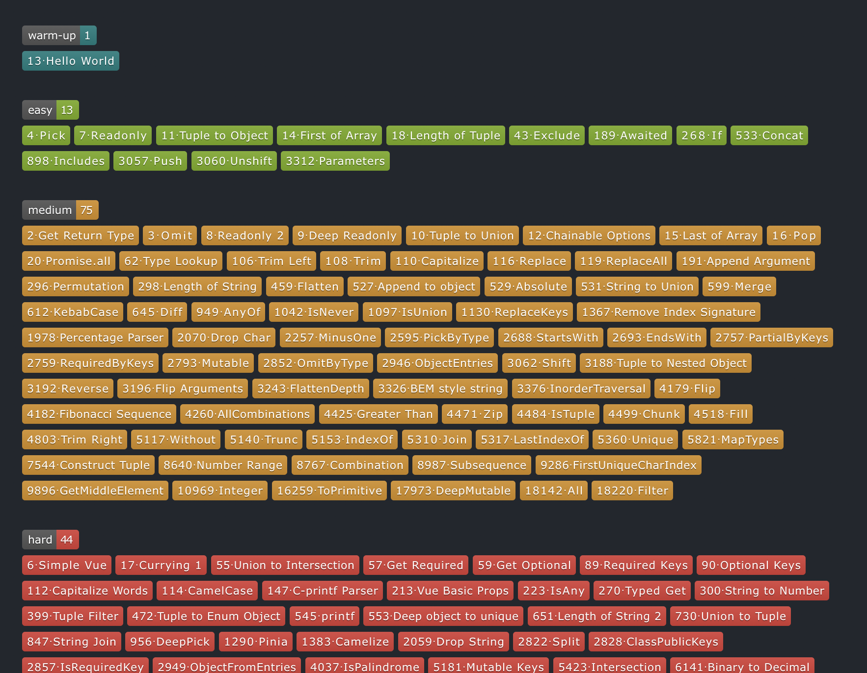 오늘 TS의 as를 사용했다가 사용하지 않는 게 좋다는 코드 리뷰를 받았다..!! as를 종종 사용했는데.. 전혀 사용하지 않으려고 하니 밑줄이 자꾸 자꾸 생겼다. TS를 공부해야겠다는 생각이 들던 중에 전에 다른 분의 회고 글에서 봤던 https://github.com/type-challenges/type-challenges 가 떠올렸다. 도전~ 위 깃허브에 들어가면 아래와 같이 문제들이 나온다. 문제 태그를 클릭하면 문제 설명이 나온다. Take the Challenge를 클릭하면 문제를 바로 풀어볼 수 있게 playground로 이동한다. your code here 부분의 코드를 수정해서 아래 test case 코드의 에러를 없애면 된다! 다른 사람들의 풀이를 볼 수 있고, 본인의 풀이도 공유할 수..