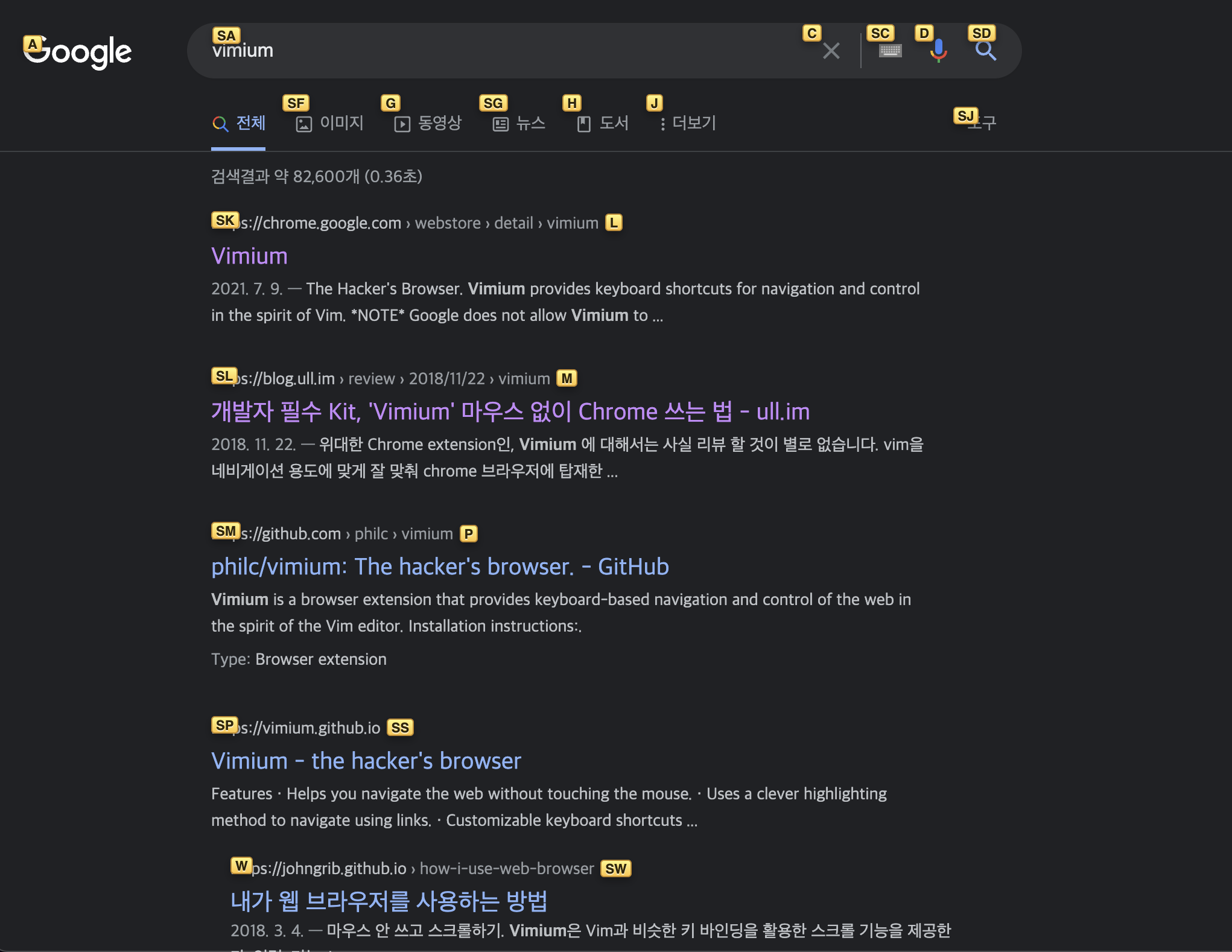 요즘 브라우저(크롬)에서 Vim을 사용하고 있는데, 마우스 없이 키보드만으로 검색을 할 수 있어서 정말 편해요~~ 그리고 vs code에서 vim 사용하는 것보다 쉽고요. :) (삭제, 편집 같은 작업은 안하니까 그런 거 같아요 ㅎㅎ ) 크롬에서 익스텐션 vimium을 설치한 후에 사용할 수 있어요~ https://chrome.google.com/webstore/detail/vimium/dbepggeogbaibhgnhhndojpepiihcmeb Vimium The Hacker's Browser. Vimium provides keyboard shortcuts for navigation and control in the spirit of Vim. chrome.google.com 자주 쓰는 단축키 🔖 상하좌우..